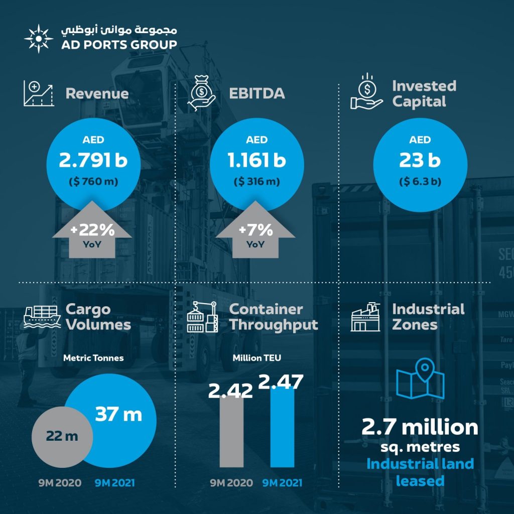 AD Ports Group today announced its financial results for the nine months ended September 30, 2021, reporting revenue growth of 22% year-on-year to AED 2.791 billion (USD 760 million) compared with AED 2.295 billion (USD 625 million) in the same period last year, driven by volume growth, business diversification and new partnerships.
