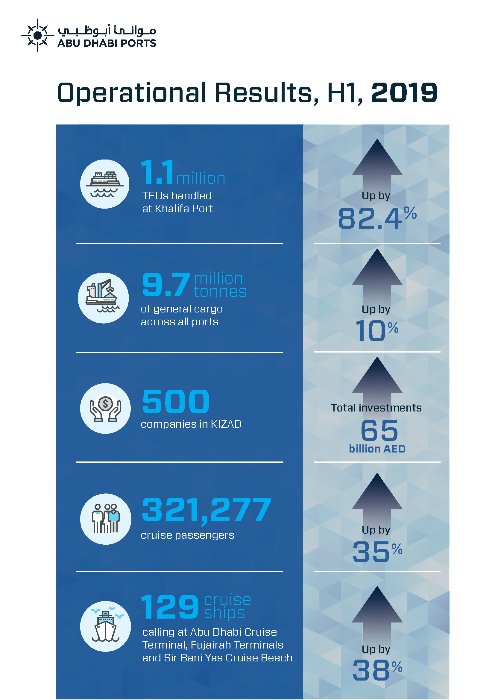هذا، وسجلت موانئ أبوظبي أيضاً نمواً كبيراً في حجم مناولة البضائع عبر الموانئ التابعة لها، بما فيها مرافئ الفجيرة وميناء زايد وميناء مصفح، إذ ارتفع إجمالي مناولة البضائع العامة إلى نحو 9.7 مليون طن خلال النصف الأول من 2019، أي ما يعادل زيادةً بنسبة 10% مقارنةً بالفترة ذاتها خلال العام الماضي.