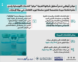 وأضاف : "تواصل موانئ أبوظبي التزامها بتنويع وتوسيع حلولها اللوجستية لتلبية المتطلبات الخاصة بكل أنواع اللقاحات في السوق من خلال أسطولنا الحديث المخصص لمرحلة التوصيل الأخيرة. وإننا نعمل من خلال تعاوننا الوثيق مع دائرة الصحة – أبوظبي على ضمان امتلاك شركة "ميكو" لأكثر الشاحنات المبردة تطوراً بما يسهم في تعزيز الإمكانيات اللوجستية للإمارة لأعوام عديدة قادمة".