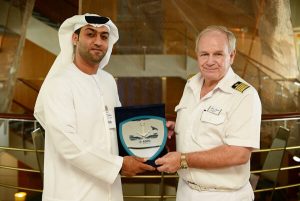 Captain Jaber Al Shehhi Harbour Master of Mina Zayed of ADPC (left) presents a plaque to Captain Kjell Holm, Captain of TUI Cruises’ Mein Schiff 2, to mark the occasion of the maiden call of the vessel to Abu Dhabi. Mein Schiff 2 is the wellness flagship of Germany’s TUI Cruises. Its arrival to Abu Dhabi’s Mina Zayed port will be the first of 20 calls to the UAE capital this cruise season for the 956 cabin vessel.